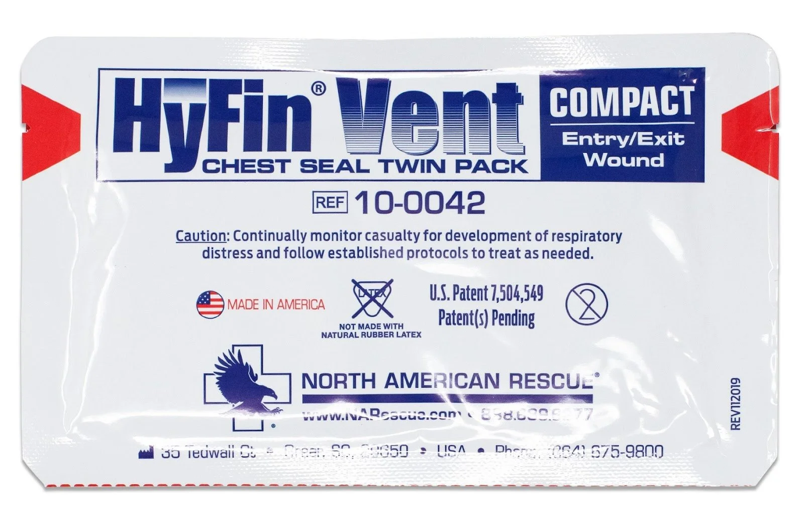 Hyfin Chest Seal is a vented chest seal used to treat penetrating chest wounds. The unique vented design allows air to escape during exhalation but not make its way back in during inhalation