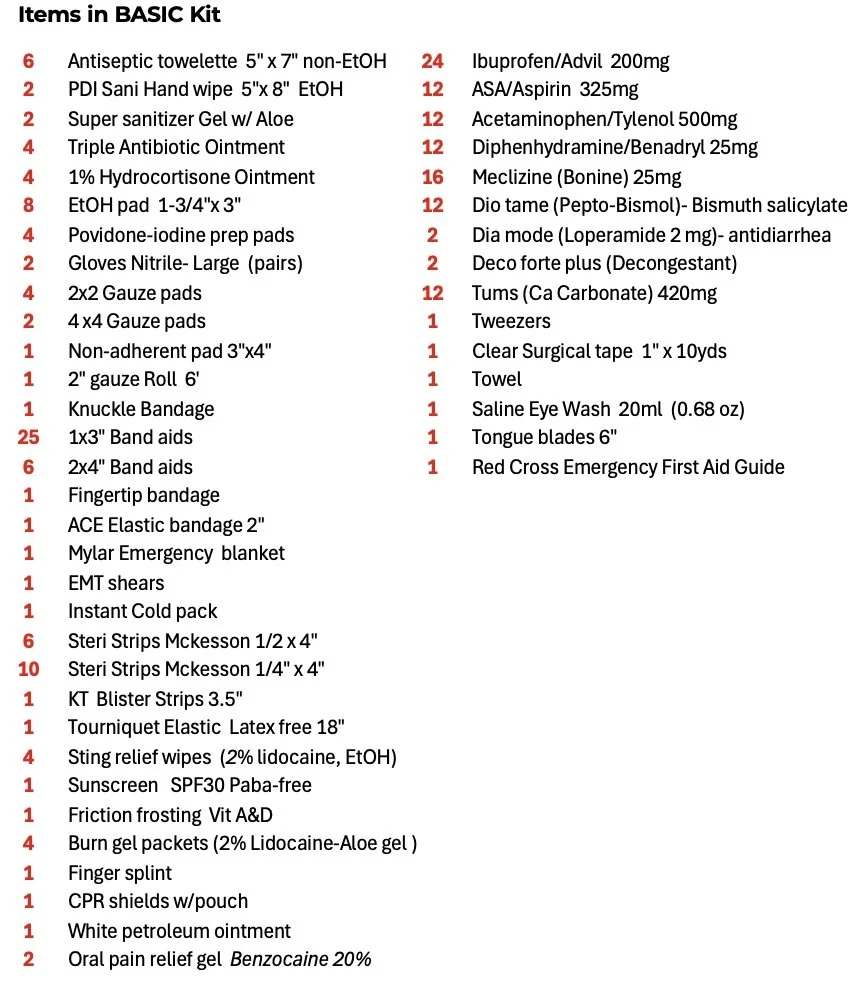 Essential supplies: SAMXT Tourniquet, Quik Clot hemostatic Gauze, Hyfin Chest seals, Emergency Pressure bandage, Compressed gauze, EMT shears, Mylar blanket